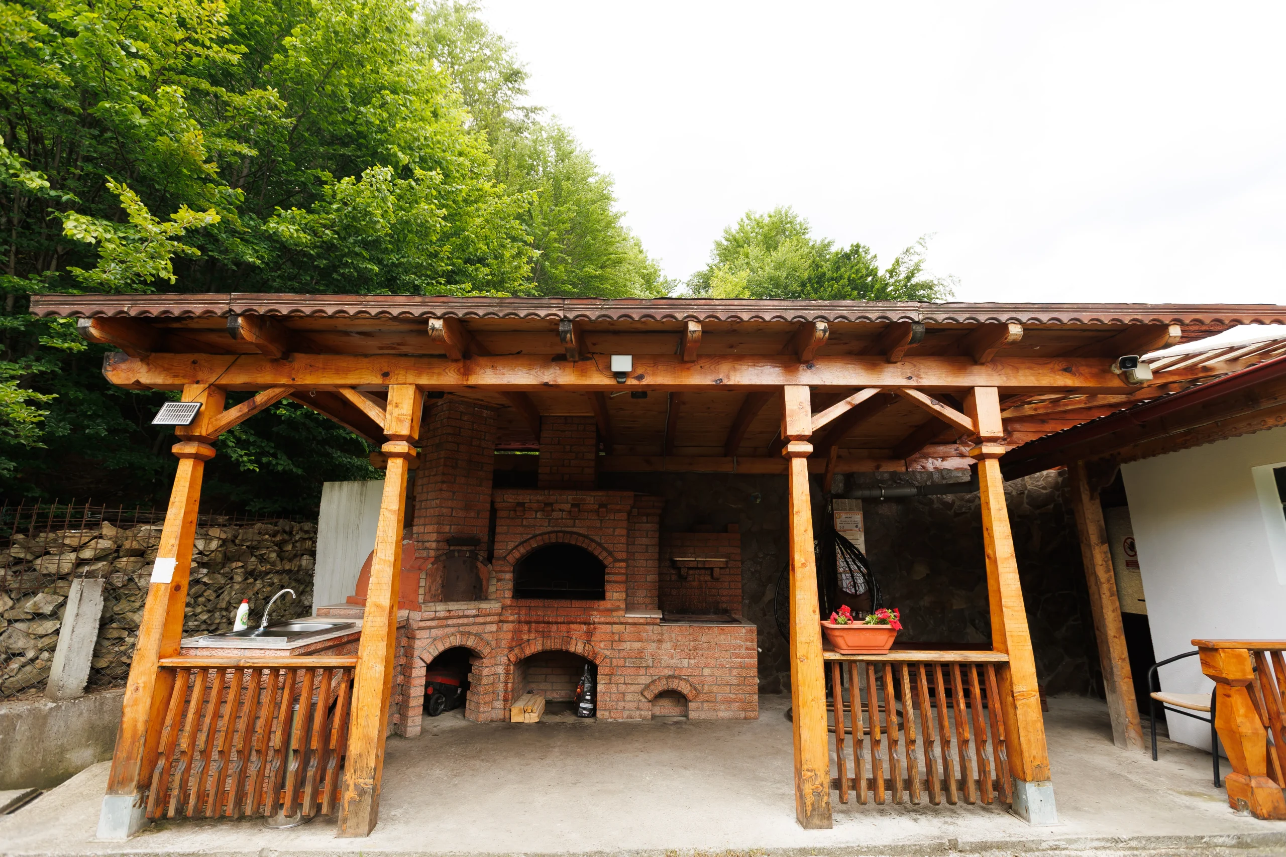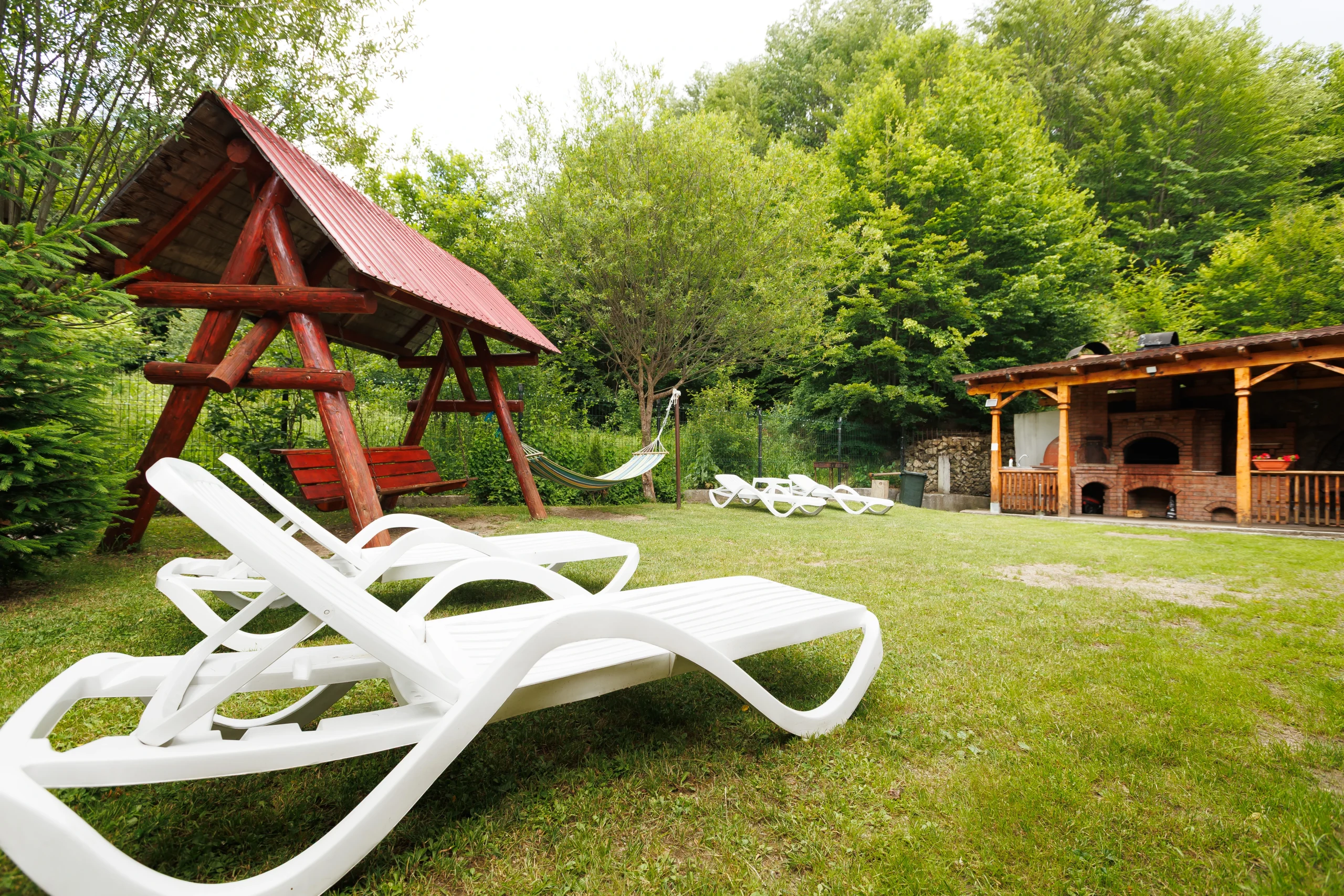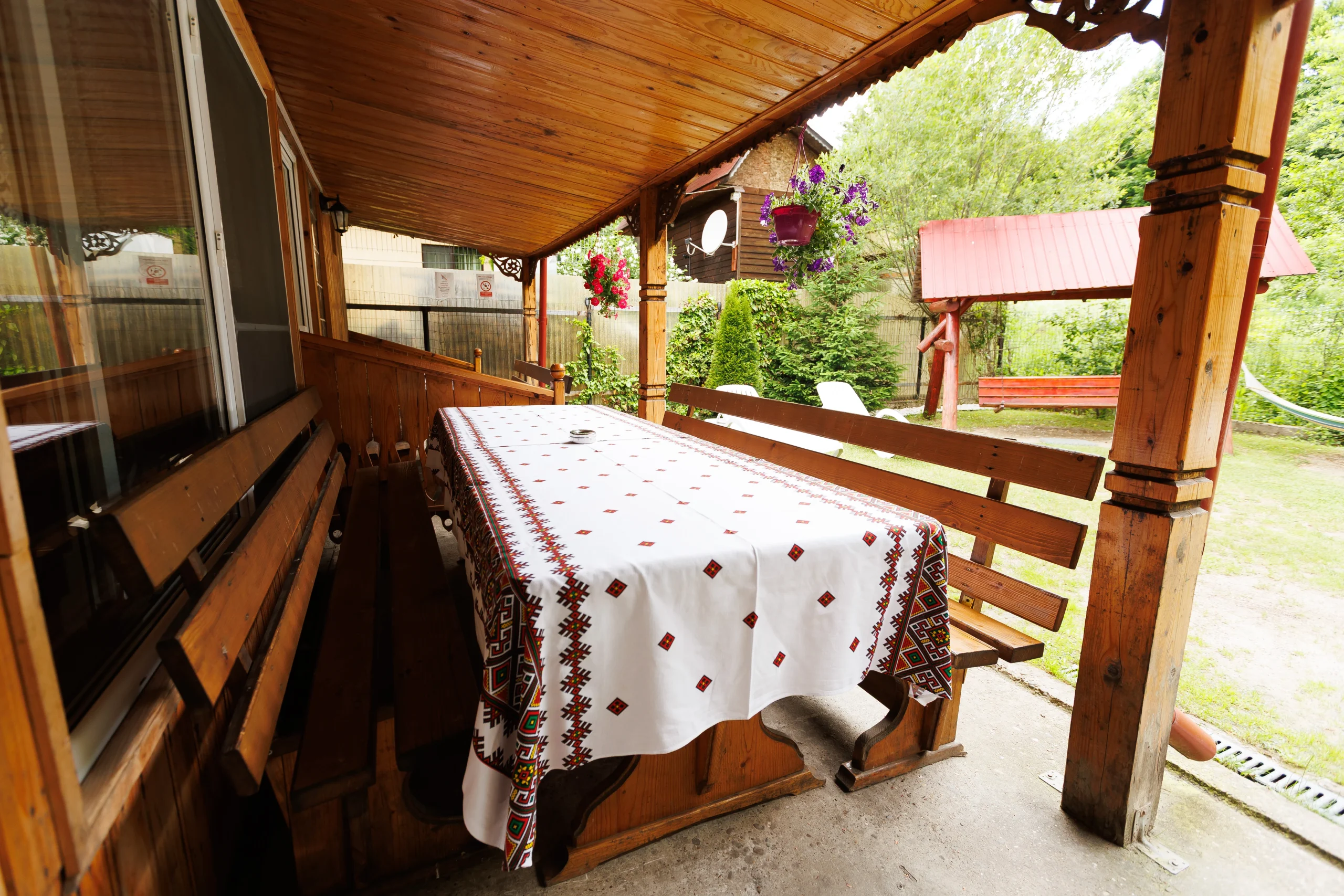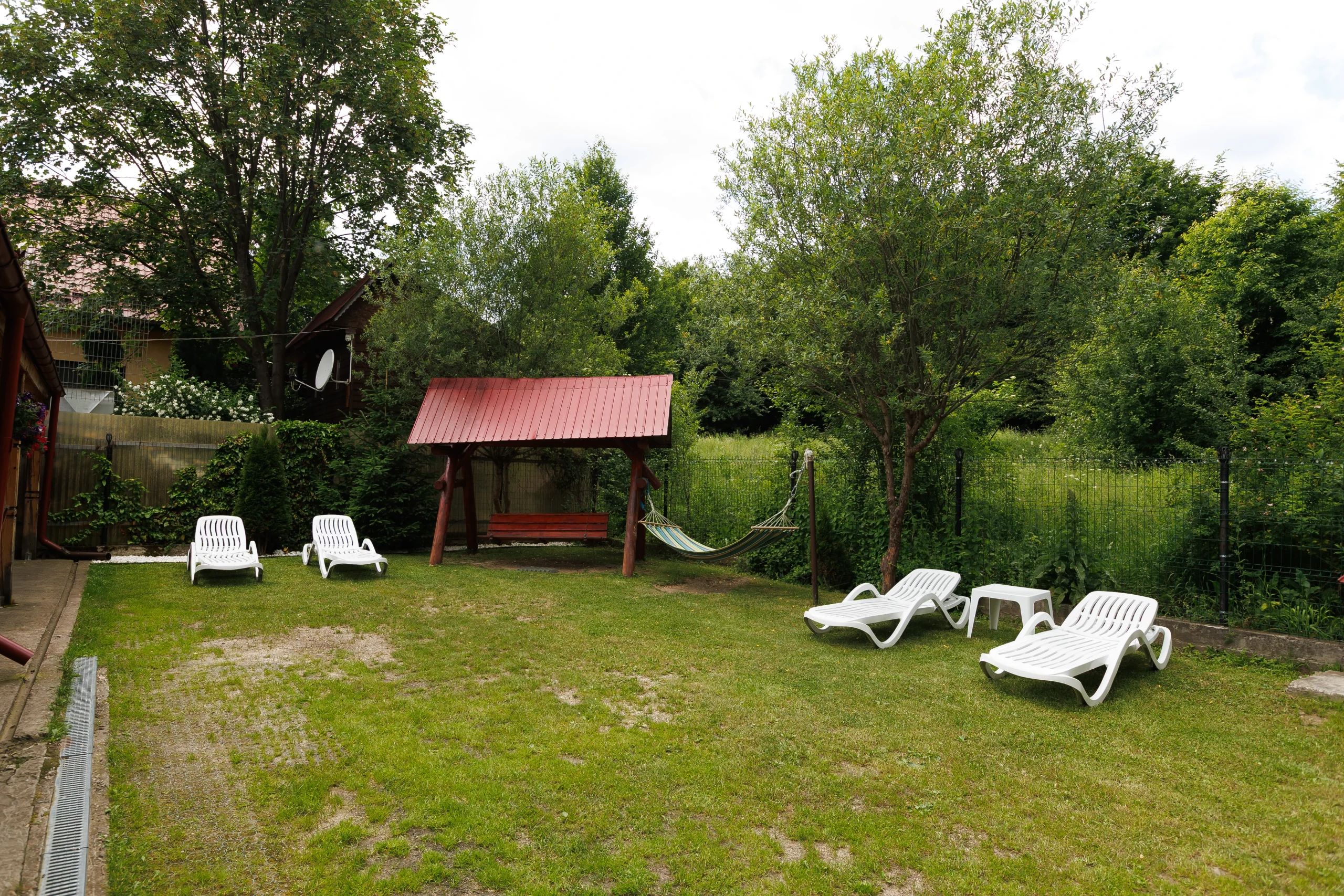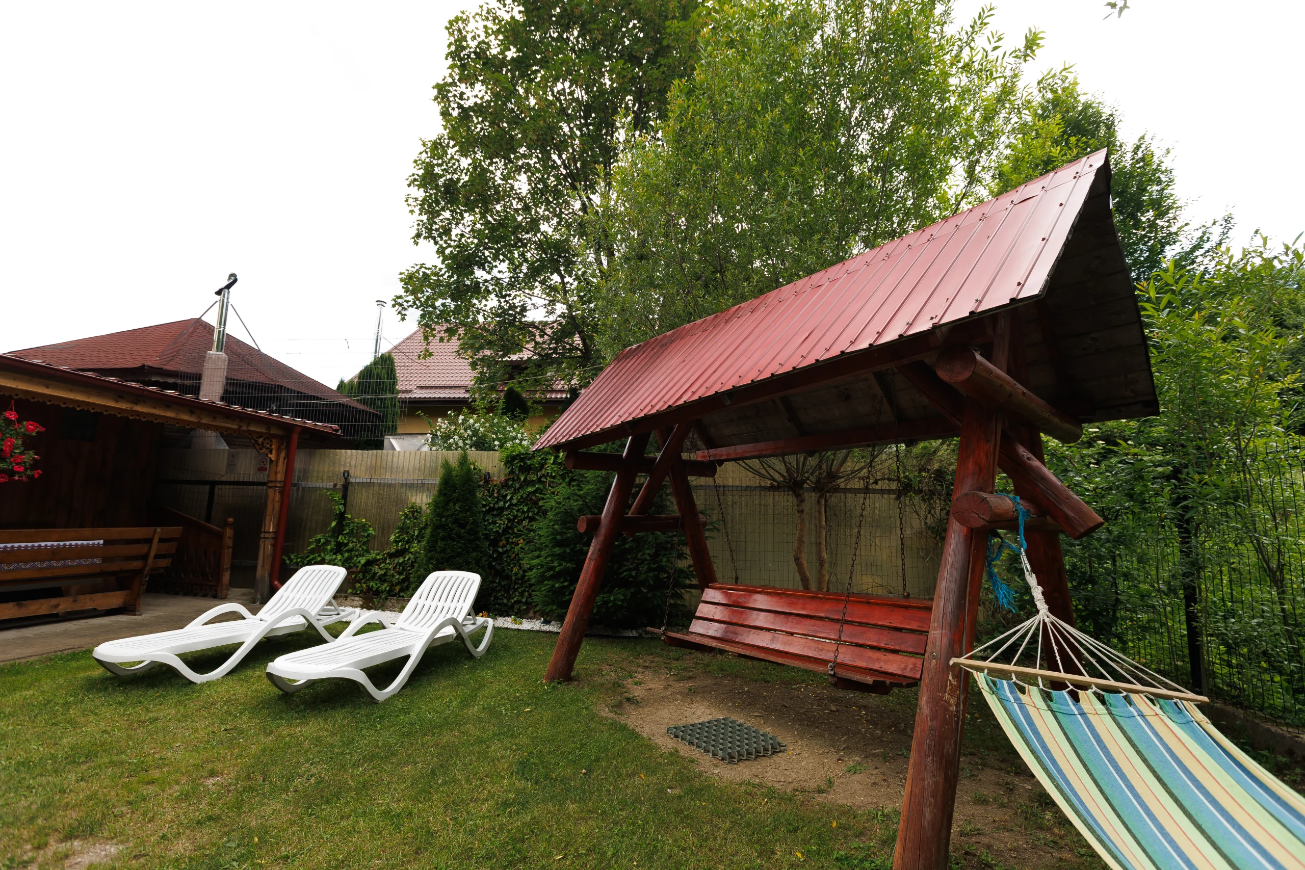 Foișorul cu grătar, leagănul, hamacul și curtea verde care te invită la relaxare în aer curat, în inima naturii din Lepșa, dar și terasa închisă care continuă armonios cu o sală de mese spațioasă și o bucătărie open-space, amenajate integral în stil tradițional din lemn, creând un ambient cald și primitor pentru seri petrecute alături de cei dragi